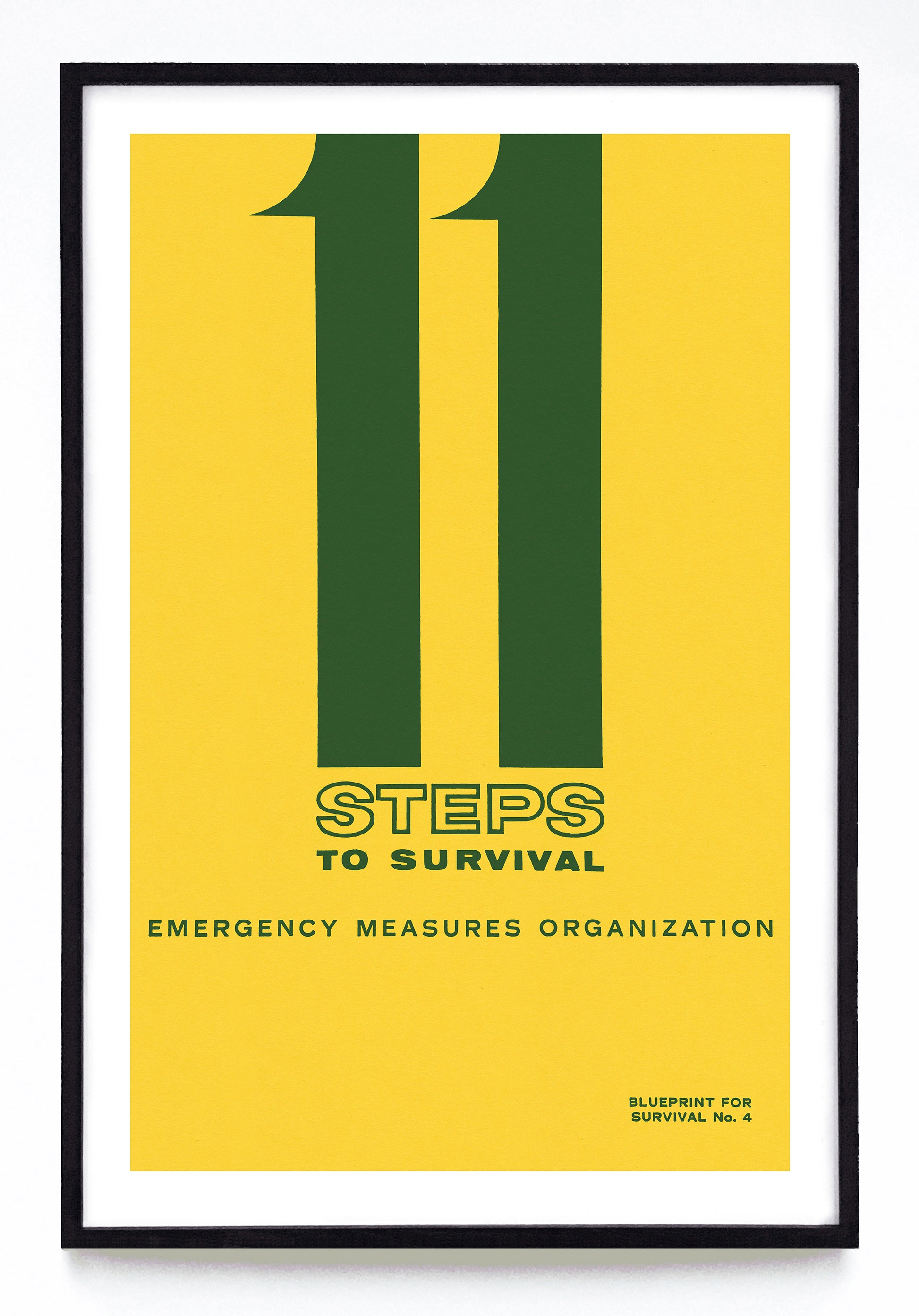 11 Steps to Survival is the fourth instalment in Canada's "Blueprint for Survival" series and its cover is a minimalist gem. I always admire a designer that's willing to emphasize the quantity of a thing (11) instead of other parts of a headline—in this case "steps" and "survival". I don't have a physical copy of the booklet itself, but I have recreated a note-perfect and high-definition version of it. Check it against an original and you'll see what I mean.