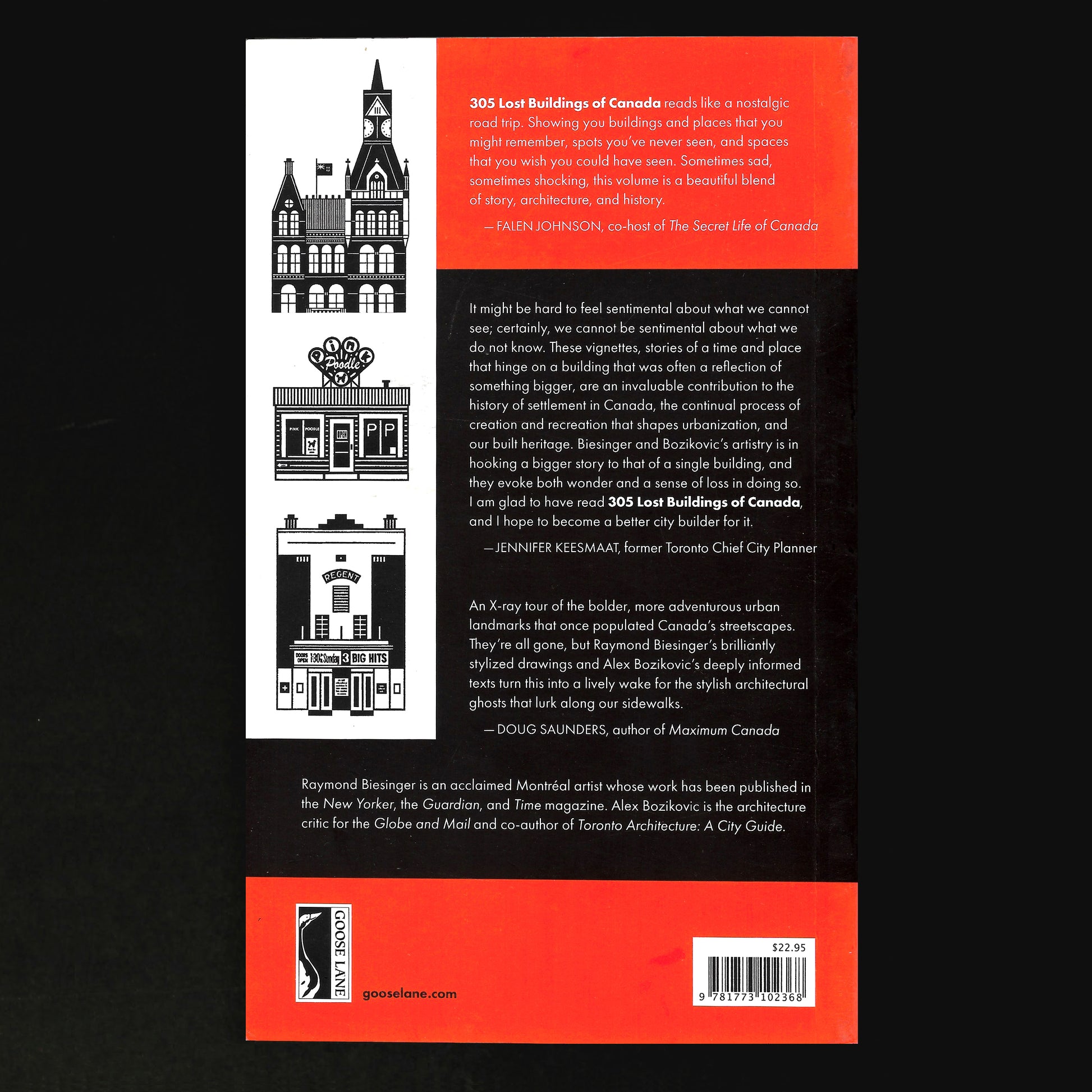 305 Lost Buildings of Canada began as my "Lost Buildings of Canada" print series but was greatly improved by the writing of Globe & Mail Architecture Critic Alex Bozikovic and the actions of Goose Lane Editions. What I drew between 2017 and 2021 Alex thoughtfully researched and described, creating a guidebook to an impossible-to-see architectural tour.