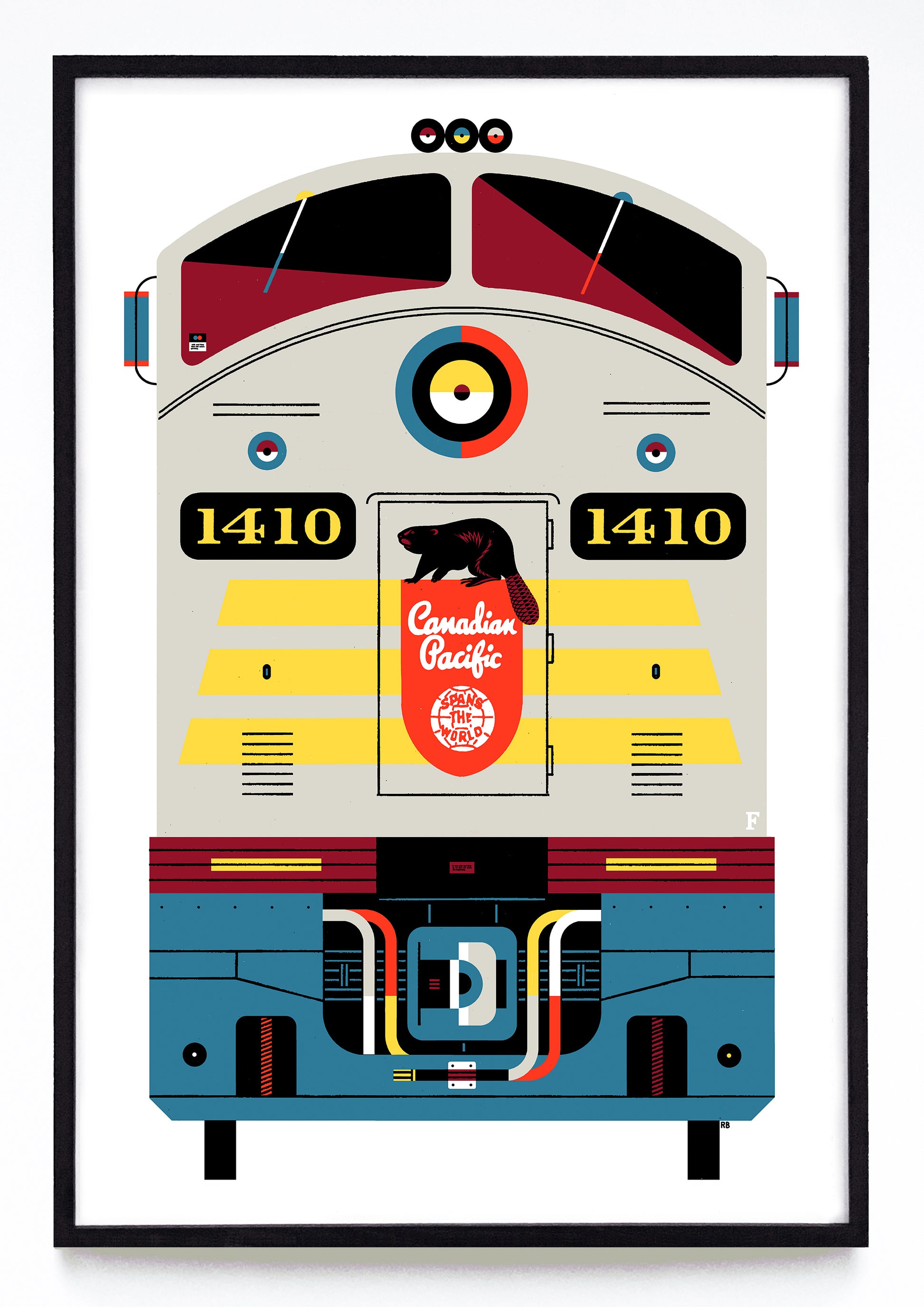 I started drawing locomotives of note by taking on Canadian National Railway No. 7229, which is a GP9RM "port job" switcher locomotive that serves Montréal's south side. It spends a lot of time at the Pointe St. Charles yards just a few blocks from my place, and I thought it an excellent thing to make a portrait of. Want to see the real thing? Just go up to the Rue Sebastopol lookout and I bet it's there pulling rail cars, as it has for decades. Then came Canadian Pacific Railway No. 1410 in classic CP livery and a late '80s VIA No. 6440 in bold yellow. Last up? The Ontario Northlander No. 1510, as it looked serving between Toronto and Cochrane with regularity in the 1950s.