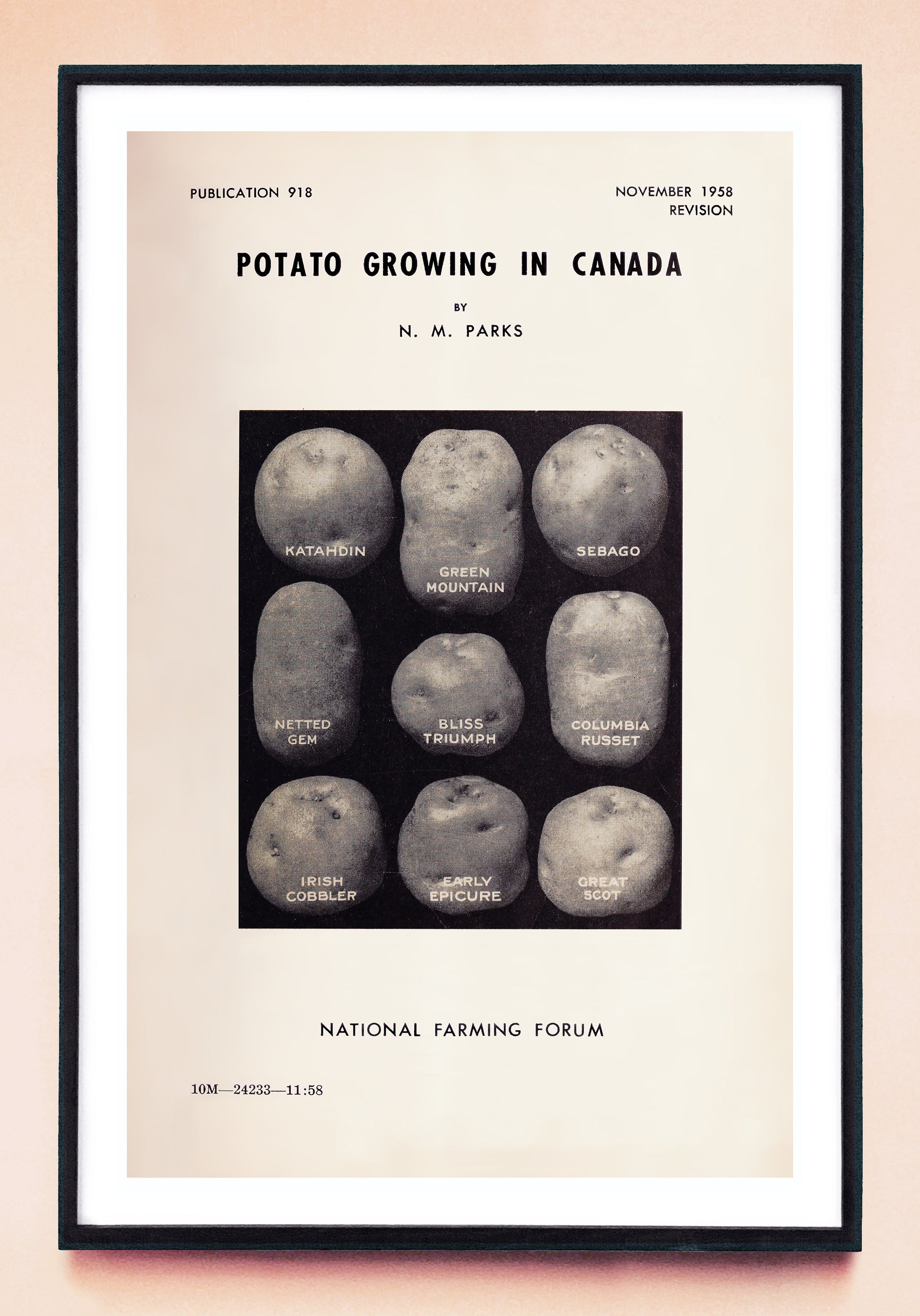 Theoretically this is the original French version of a 1956 booklet, but it's looking pretty Frenglish to me—whoever was in charge didn't think the text embedded in the potato diagram was worth translating. It's a shame, because that embedded text is incredible. Sign me up for a "Netted Gem" or "Early Epicure", and "Bliss Triumph" is a feeling I wish I felt more often. In 1958 the same booklet would be published in English under the title Potato Growing in Canada.