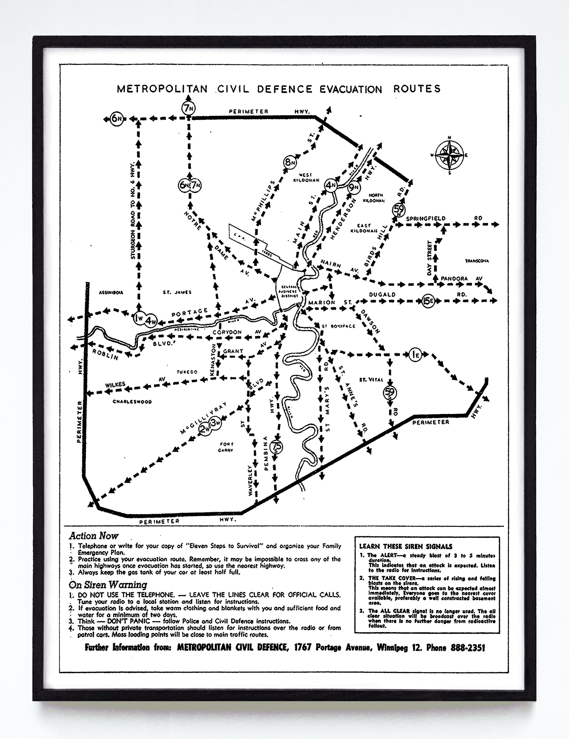 If you've read Andrew Burtch's excellent Give Me Shelter: the Failure of of Canada's Cold War Civil Defence (grab a copy right here) you know that Canadian civil defence was a bit of a hot potato, tossed between local, provincial and federal authorities who never really cooked anything with it. That means I don't know who, exactly, funded this Winnipeg evacuation map, but thanks to it I can tell you the correct route from your Grant Avenue apartment to the relative safety west of the ring road. It's up to you to drive it in five minutes, though. Good luck!